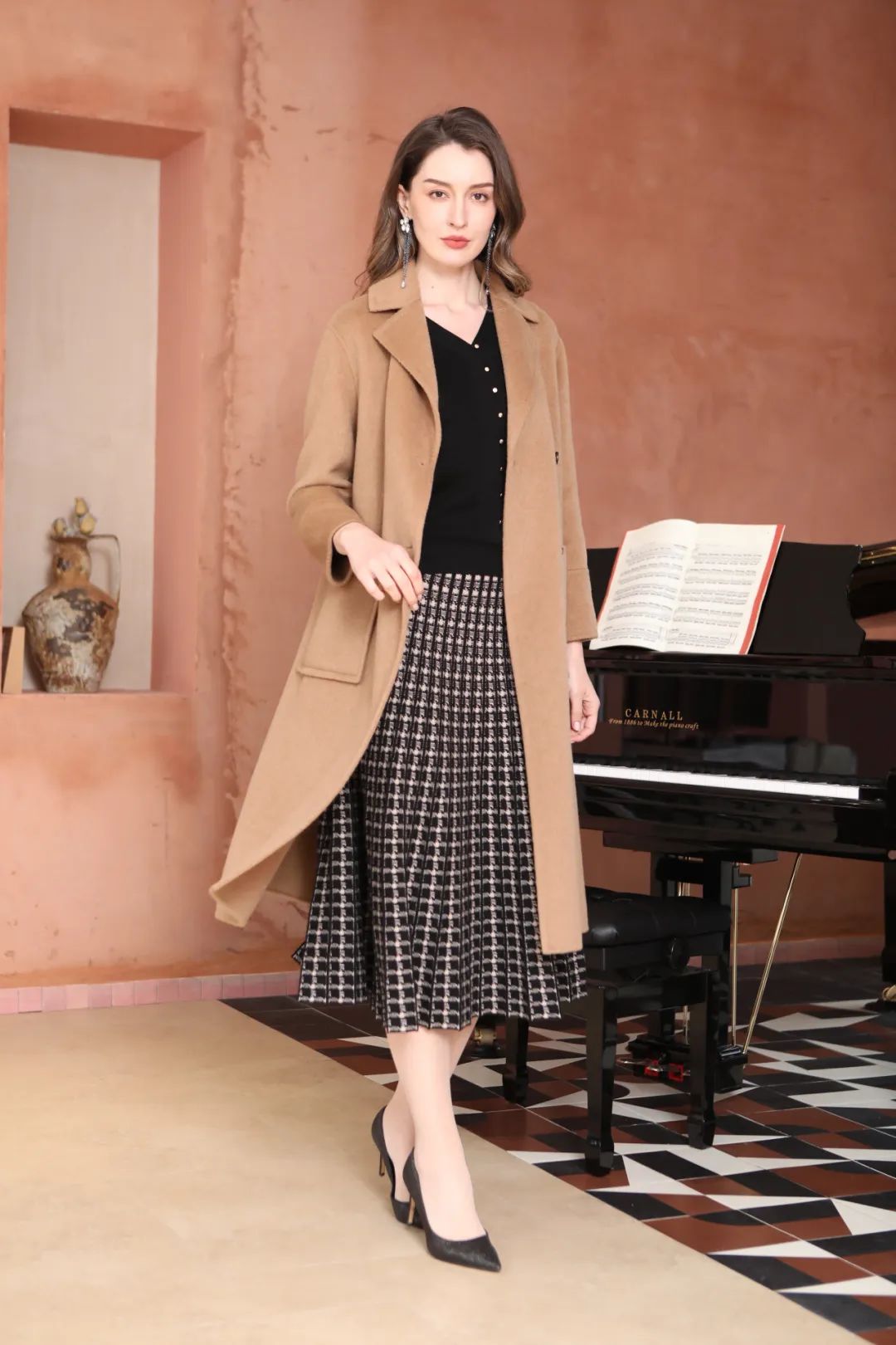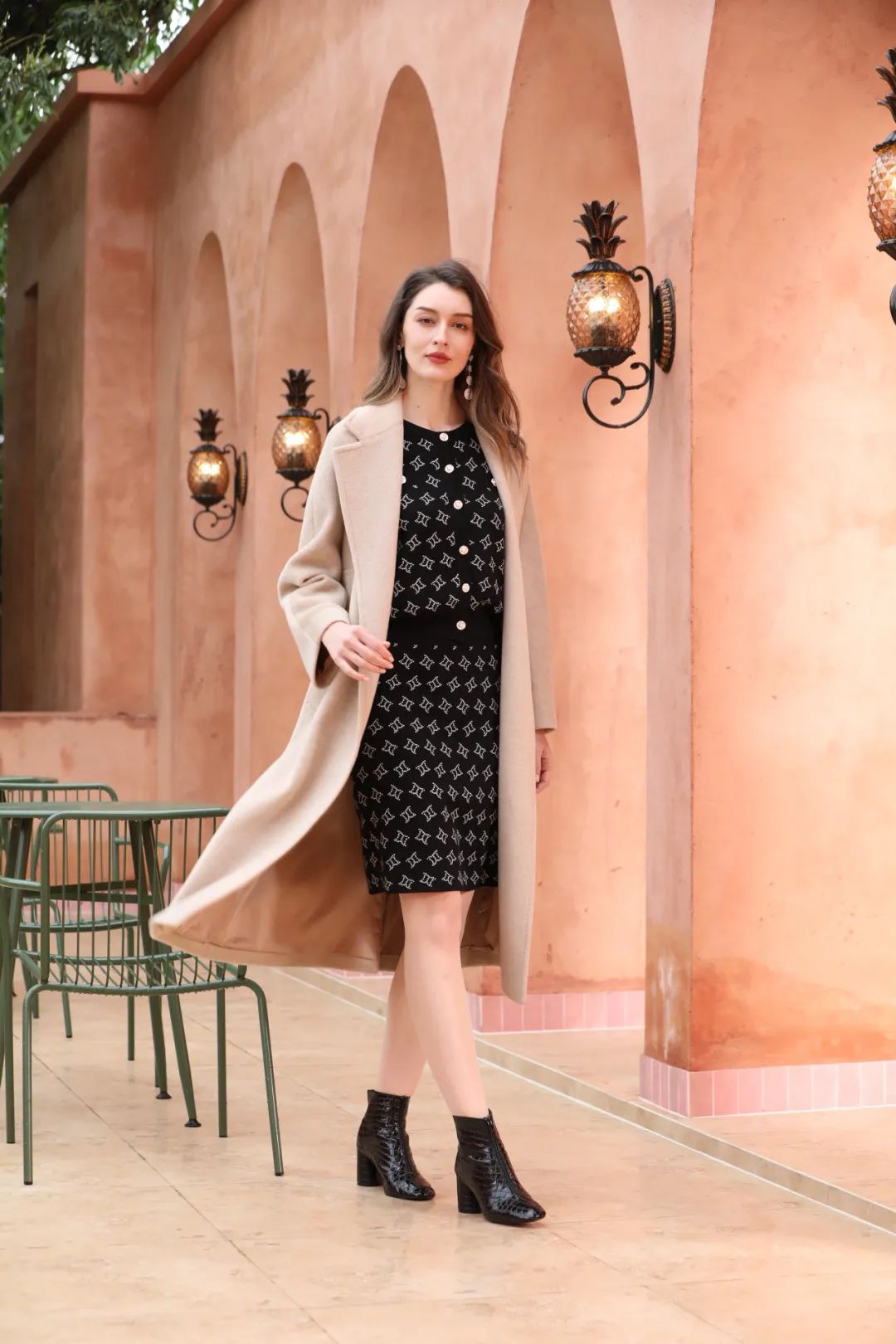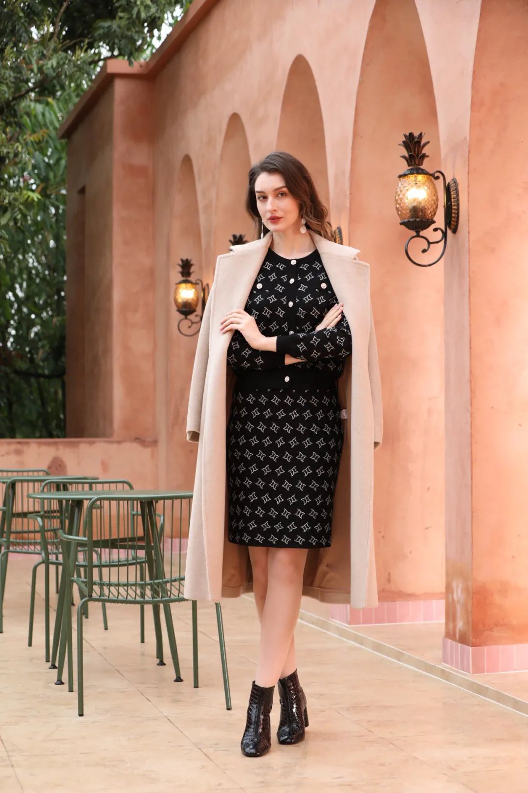 米色双面昵大衣叠穿黑色套装裙,叙写刚柔并济的优雅范式,温暖持续相伴,自在融入通勤日常,自有非凡穿着体验。