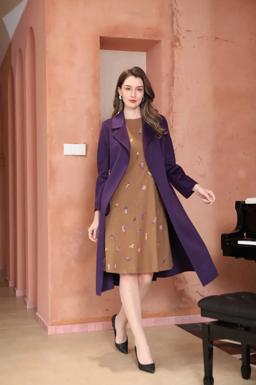 紫色双面呢大衣内搭咖色印花连衣裙,打破臃肿,萦留层叠暖意,映衬恰到好处的适意姿态,为皑皑冬日携来轻盈浪漫。