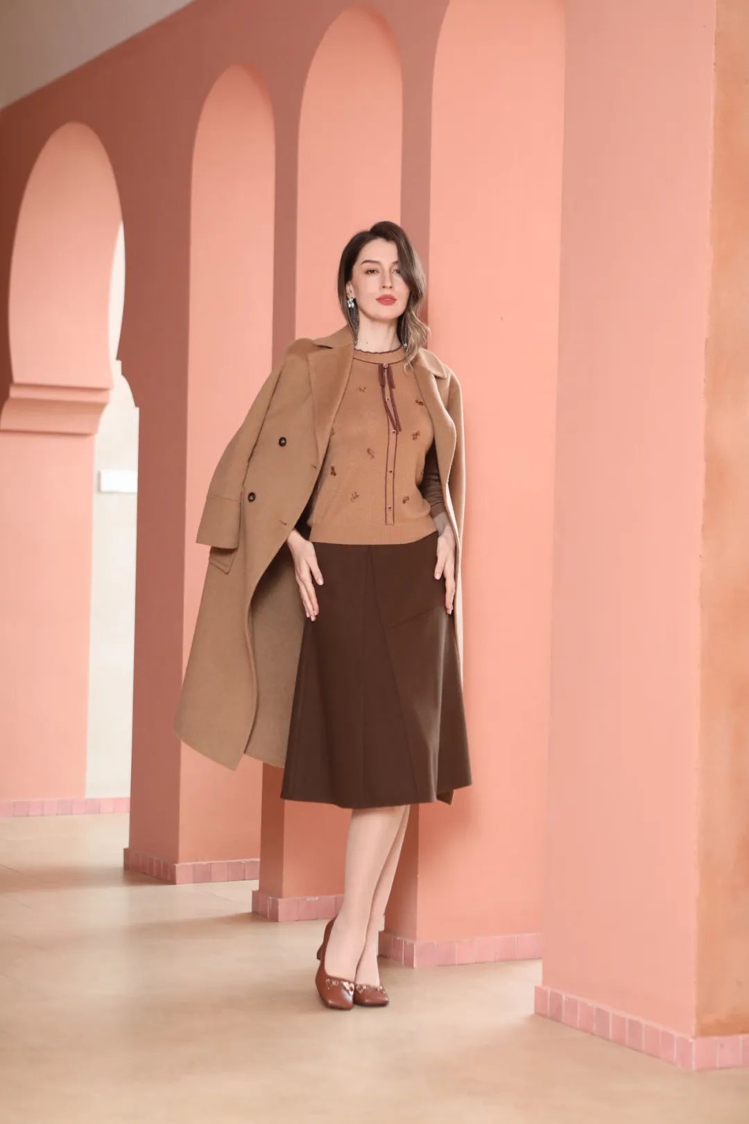着棕色半裙,跳脱厚重臃肿,坠入柔软声场,时刻轻灵,心生明媚,无拘探索,感知生活的治愈瞬间。