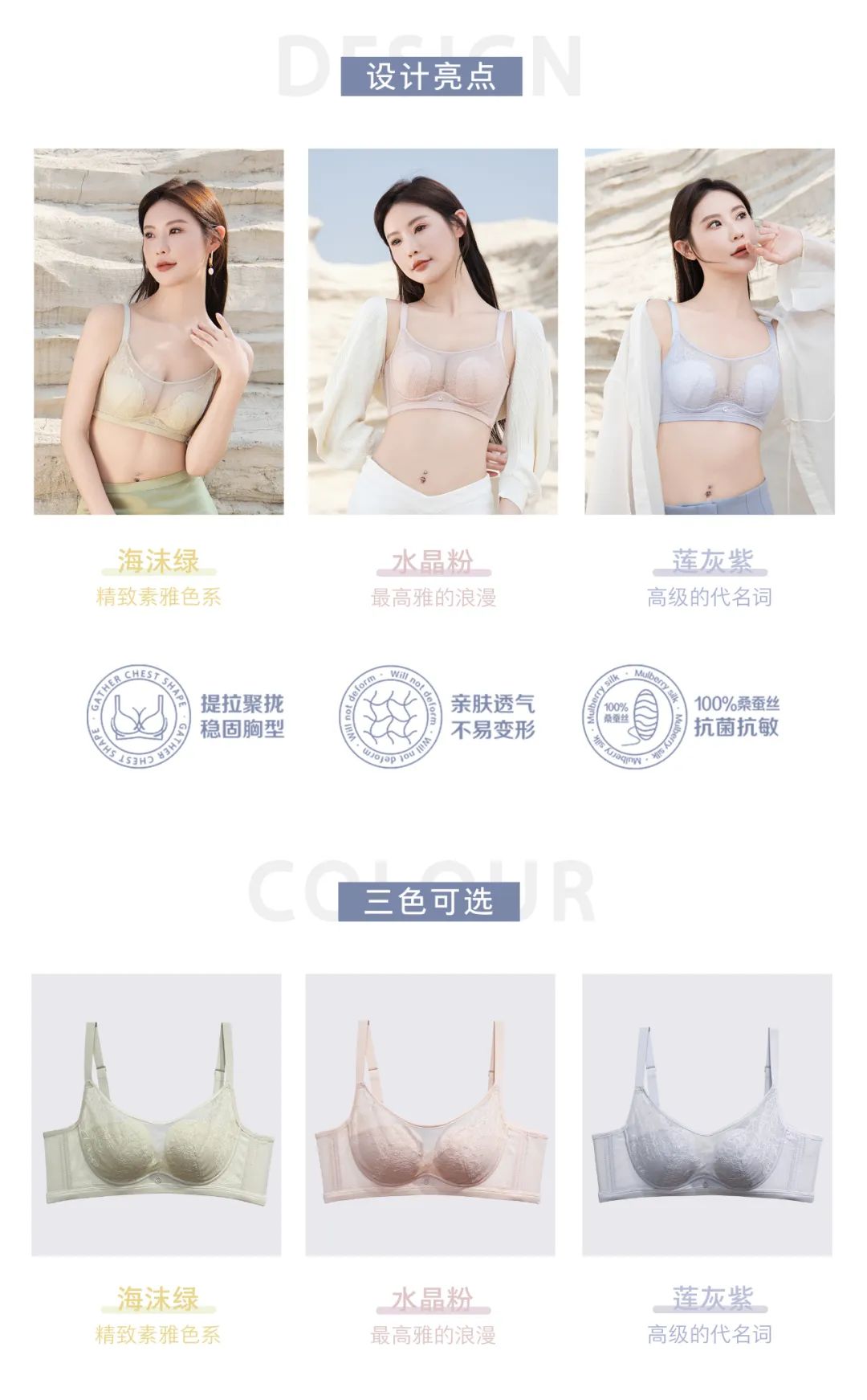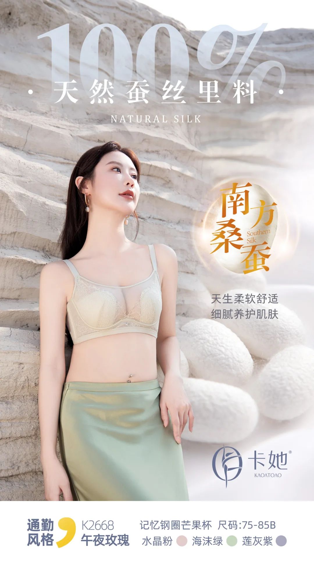 【面料】100%桑蚕丝面料,含天然蛋白和氨基酸面料,质感无可挑剔,细腻兼具弹性,体感温润,轻柔贴合肌肤,更适合过敏体质,结合自然与工艺,给女性带来自然之美。