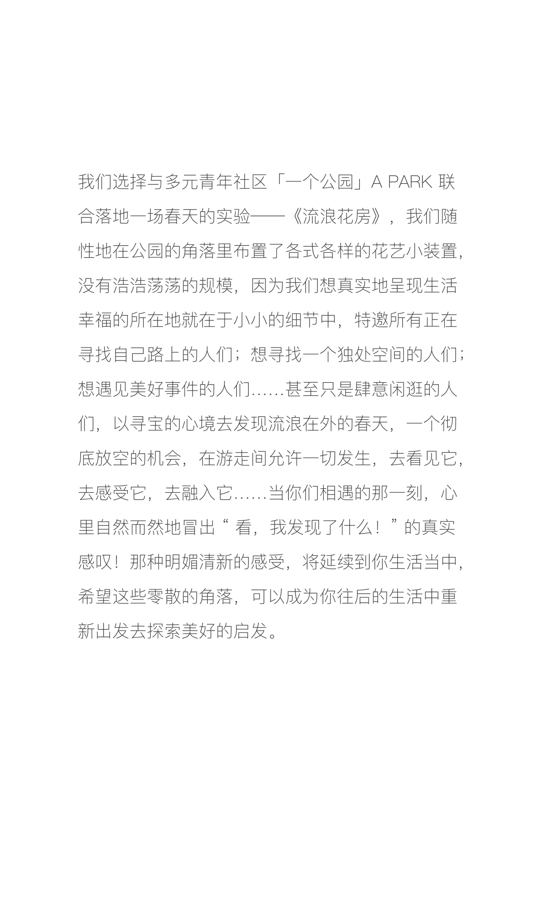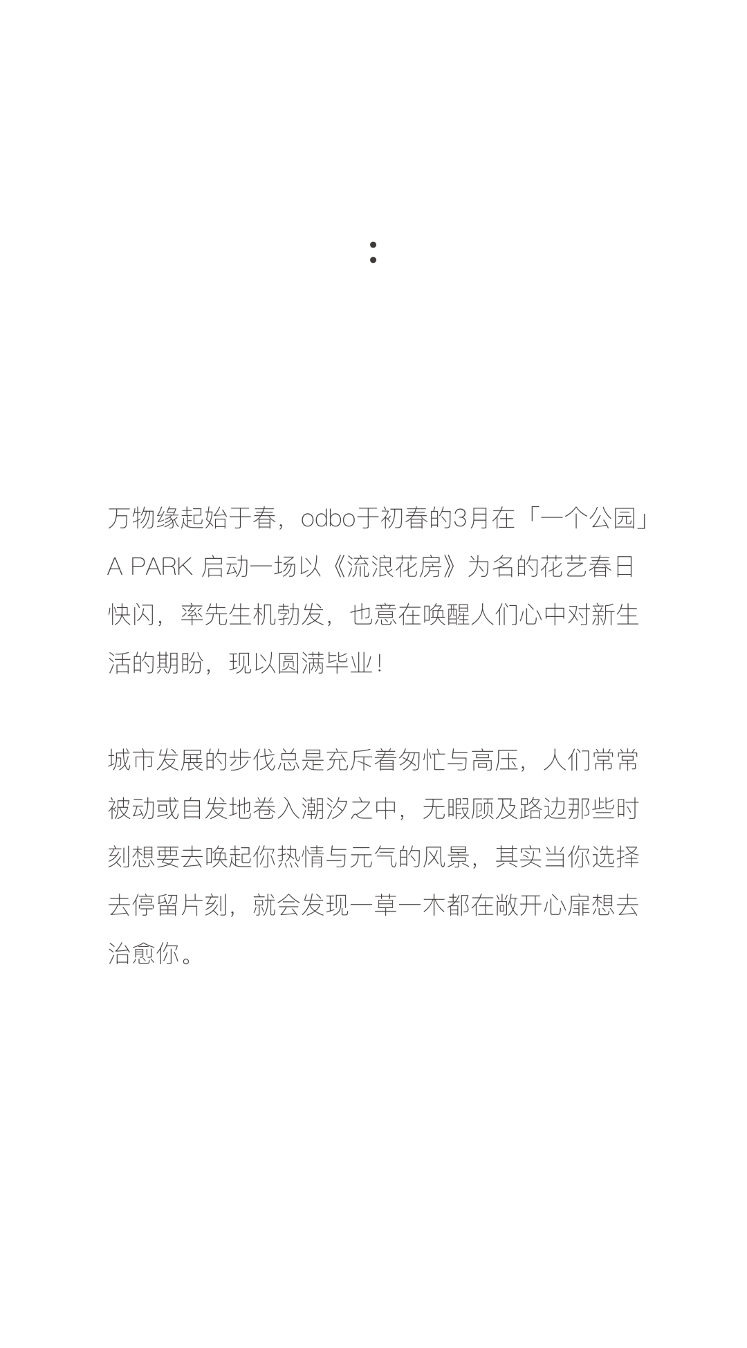 万物缘起始于春,odbo于初春的3月在「一个公园」a park 启动一场以《流浪花房》为名的花艺春日快闪,率先生机勃发,也意在唤醒人们心中对新生活的期盼,现以圆满毕业!