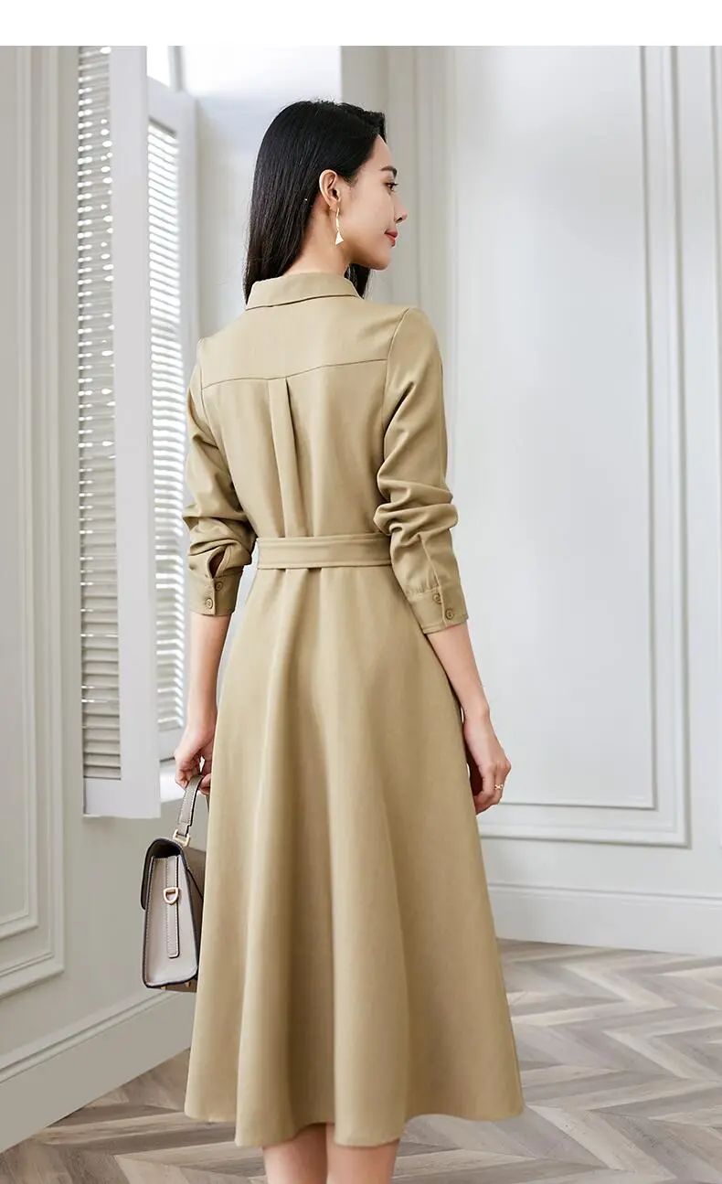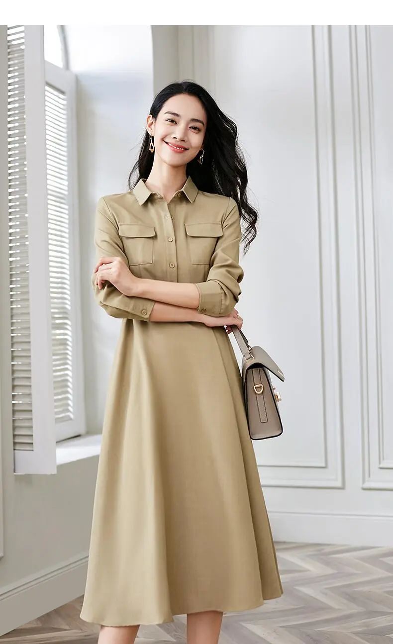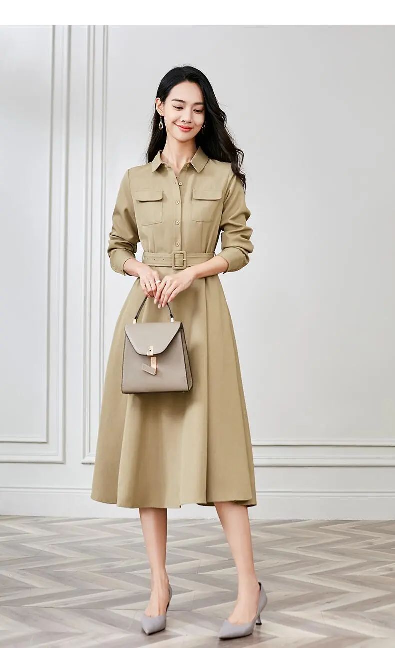 这件高腰翻领衬衫连衣裙,版型精致得体,卡其色呈现沉稳低调的精致感。