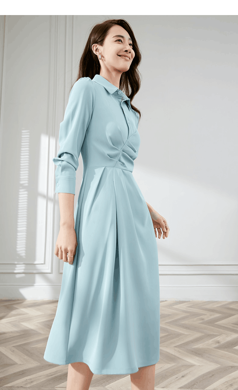 简约翻领 收腰收褶设计 通勤减龄 a字裙摆