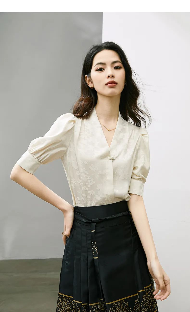 气质v领缎面提花通勤衬衫