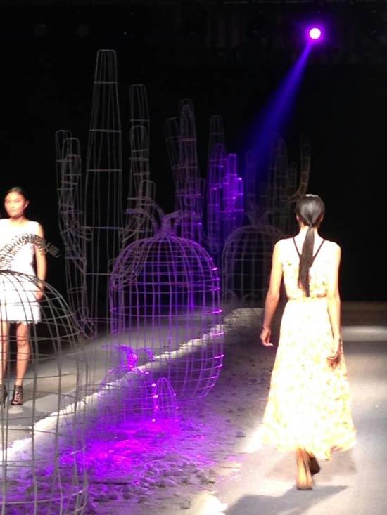 10日的Fashion show中,白色石头与热带植物造型的艺术装置在灯光下化身为秀场主场景,esons2015夏季系列中率真个性的模特们信步走来,虚实结合的面料层次、手工雕琢的条纹细节和编织元素的立体廓形,在模特们的演绎下显得随性大气,散发简洁舒适的生活气质。