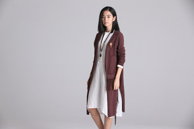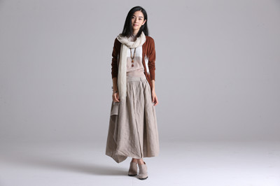 暗红色开衫,混搭卡其色苎麻长裙,清新动人的形象脱颖而出,另外,记得外搭一条温暖舒适的米色围巾哦!