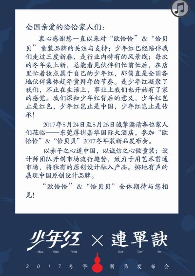 2017年5月24日至5月26日诚挚邀请各位家长们参加,东莞厚街嘉华国际大酒店,参加“欧恰恰”2017冬季年装新品发布会。“欧恰恰”&“恰贝贝”全体期待与您相见!