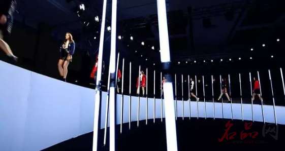 开场后,瞬时灯光闪耀,随着音乐的节奏模特们鱼贯而出。