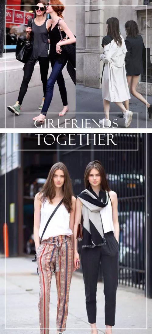 相同色系不仅最易实现,连CP效果也是最好的。同为黑色单品,搭配白色印花T绝不会出错。一条八分微喇西装裤显瘦又时髦,而深V及膝背带裙则休闲又优雅。