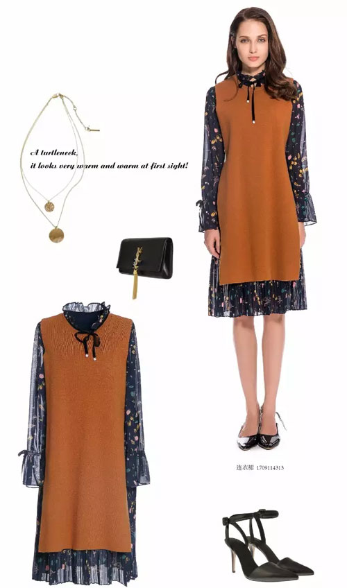 雪纺花型连衣裙,在袖口和领子部分有木耳边的设计,丝绒蝴蝶结,外搭配毛衫,让人眼前一亮。