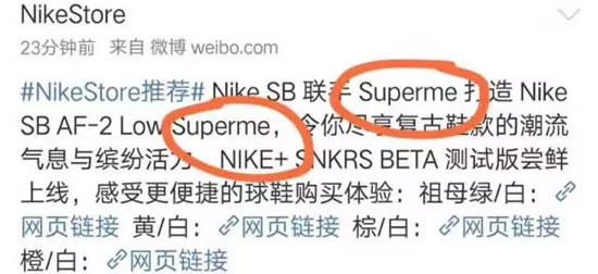 相较于Nike以往颇为高调的公关处理方式,这一次显得略微低调,在删除乌龙微博后,Nike公关团队似乎立即与微博取得联系,从根源上控制了此次事件进一步发酵。目前在微博搜索“nikestore”等相关关键词只剩下5条不具备传播效应的讽刺Nike拼错Supreme的贴文,而“Nike Supreme”和“Nike Superme”这两个关键词已搜不到相关的内容。