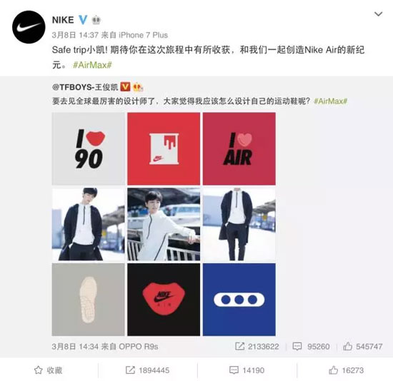 值得关注的是,今年3月8日,Nike邀请TF Boys王俊凯参观其美国总部的贴文在发布后获得超过200万次的转发,超过包括费德勒夺冠、和“刘翔活出伟大”等重要时刻的微博转发数,被称为Nike微博营销史上最成功的案例。