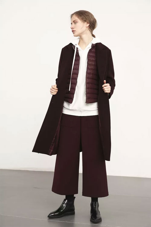 酒红色轻薄短款羽绒外套,运用衬衣袖口拼接设计,内搭于连帽卫衣和呢大衣间,整体造型既有暖感又富层次感,呈现于超凡脱俗的穿衣性情中,演绎一份舒适自我的风格。