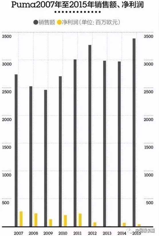 美国的竞争对手也来势汹汹,耐克的年销售额从2012年的241亿美元增长到了2014年的278亿美元,新秀UnderArmour更是后来居上,2014年全年销售额增长了32%。PUMA在2007年被拥有AlexanderMcQueen,Gucci等奢侈品品牌的开云集团收购,而它此前的糟糕成绩一度让业内传出“开云集团将出售PUMA多数股权”的消息,分析师甚至做出“PUMA2020年的业绩还停留在2007年水平”的预测。