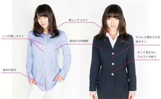 以衬衫为例,通常情况下,“D罩杯以上”的女性顾客穿着其他品牌的衬衫,肩宽合适,但胸部会因为太大而变得紧绷。“HEART CLOSET”的衬衫做了适合胸部弧度的立体设计,而且为了防止胸部将扣子部分撑开露出缝隙设计了隐形扣子。