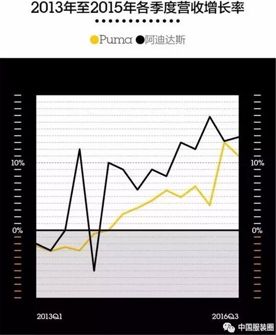 美国的竞争对手也来势汹汹,耐克的年销售额从2012年的241亿美元增长到了2014年的278亿美元,新秀UnderArmour更是后来居上,2014年全年销售额增长了32%。PUMA在2007年被拥有AlexanderMcQueen,Gucci等奢侈品品牌的开云集团收购,而它此前的糟糕成绩一度让业内传出“开云集团将出售PUMA多数股权”的消息,分析师甚至做出“PUMA2020年的业绩还停留在2007年水平”的预测。
