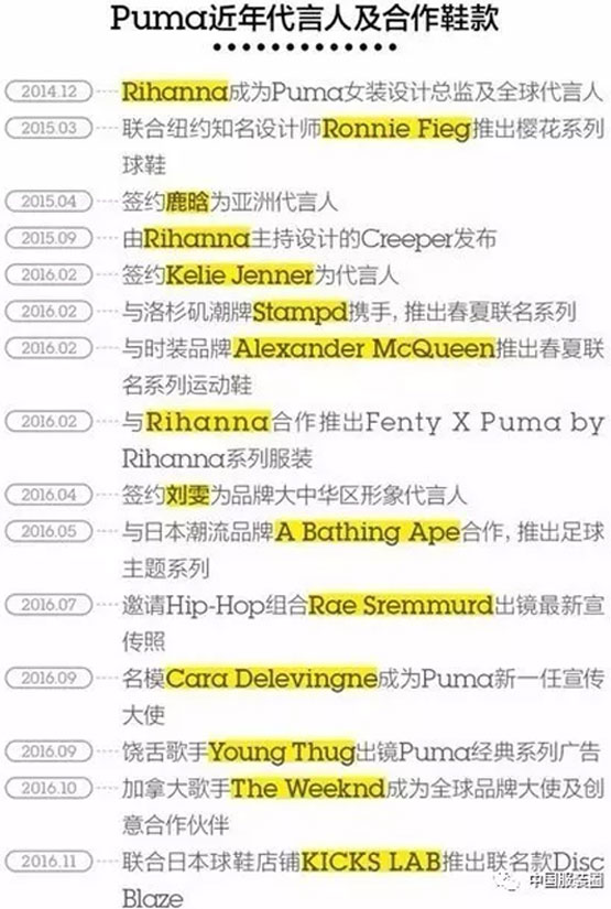 代言及联名合作推动明星效应,上世纪70-90年代,是Puma历史最辉煌的时期,尤西比奥、贝利、克鲁伊夫、马拉多纳等球星都穿着Puma king系列获得了自己职业生涯的最高荣誉。2014年时,PUMA以5年1.7亿英镑的价格成为了英超老牌球队阿森纳的设备供应商,后者此前同耐克合作了20年,它常年英超四强的位置让PUMA增加了在欧洲顶级足球联赛中的关注度,还有今年蕾哈娜的系列。