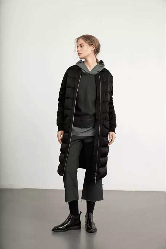浓郁而亲和的墨绿色连帽衬衣,不同材质的拼撞极具张力与层次感,与黑色羽绒外套混搭显出十足的摩登感。