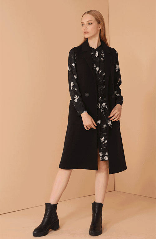 高雅的印花裙装搭配黑色马甲,彰显了优雅的气节之风,在衬托肤色的同时更增添一抹娴雅之味。