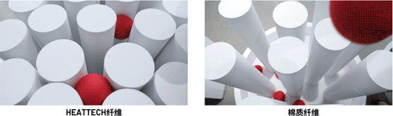 以消费者最熟悉的HEATTECH系列为例,博览会通过现场大型装置展示了该技术的吸湿发热科技,直观地解释了东丽特制超细纤维能吸收人体水蒸气,并将水蒸气转化为热能这一原理。由4种不同纤维编织的特殊结构,能把热量锁进纤维空隙形成的空气层,发挥隔热效果使得面料持续保暖。