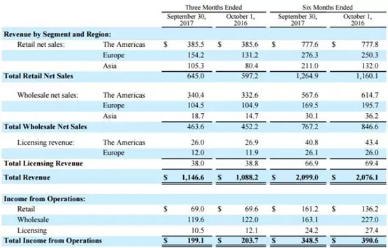 在上半财年内,Michael Kors销售额同比增长1.1%至21亿美元,其中零售销售额增长9%至12.6亿美元,批发销售额受集团削减百货渠道出货量影响减少9.4%至8亿美元,许可经营收入下跌3.6%至6690万美元。