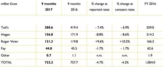 在截至9月30日的前9个月内,意大利奢侈品集团Tod's受其批发渠道和核心鞋履部门表现不佳影响,销售额同比减少4.7%至7.22亿欧元,而去年同期为7.58亿欧元。其中,集团核心鞋履销售额同比下跌4.9%至5.74亿欧元。
