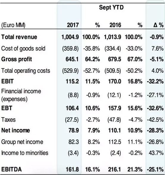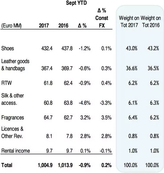 Salvatore Ferragamo 2017前三季度主要业绩数据