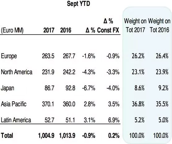 欧洲地区销售额同比减少1.6%至2.63亿欧;北美市场销售额下跌4.3%至2.32亿欧元;