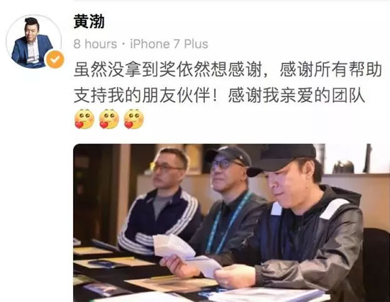 26日凌晨,黄渤在微博发文:“虽然没拿到奖依然想感谢,感谢所有帮助支持我的朋友伙伴!感谢我亲爱的团队”。黄渤是一个一向对自己要求很高的演员。网友们也纷纷表示:“一直支持你!黄渤,你就是我心目中的影帝”“在我们心中你就是影帝”“渤哥,您永远是最棒的”“渤哥你是最棒的演员”。