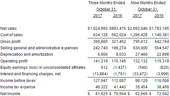 图为G-III集团第三季度主要业绩数据
