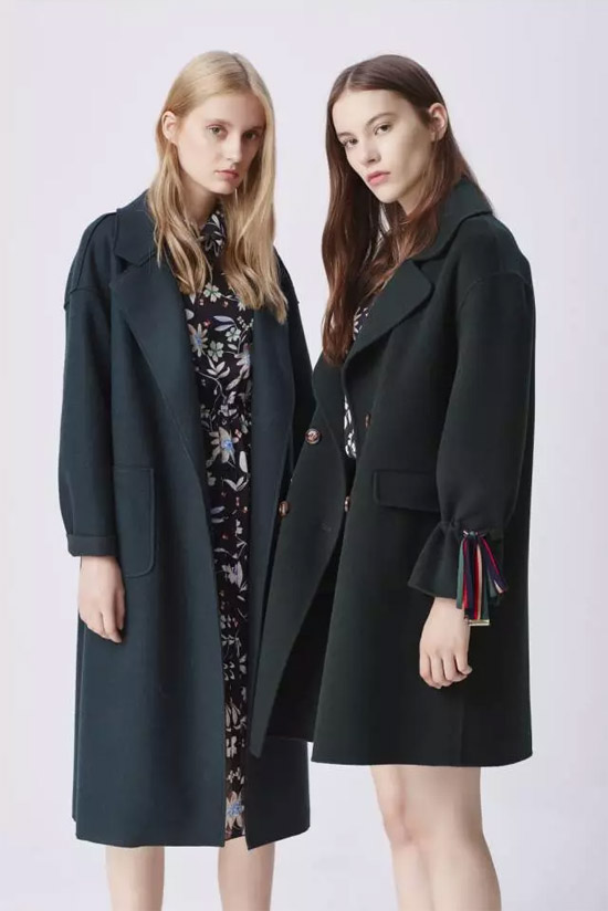 墨绿色双面呢,很有节日氛围,袖子采用撞色织带的抽绳设计,时尚新颖,增添亮点与设计点。