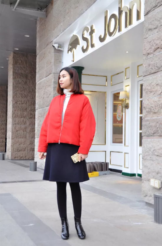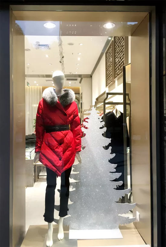 伊缔莎圣诞橱窗装扮,红色外套加上可爱半裙可是最佳选择,舒适温暖,又很好搭。