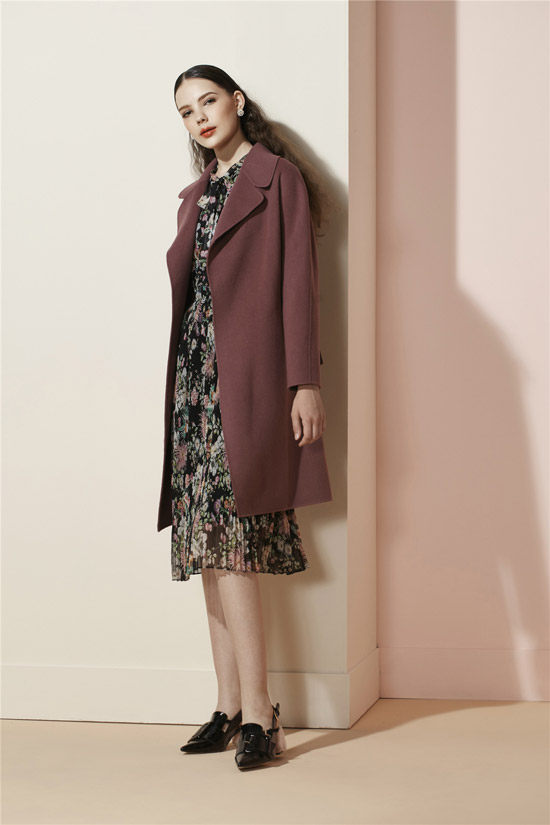 羊毛双面绒粉紫大衣优雅柔美,大翻领经典百搭,腰带可以自由调节收腰,搭配印花连身长裙,因为收腰的设计和大气的廓形变得更加复古迷人。