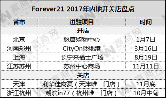 此前,Forever21天津、杭州唯一门店也被爆于2017年10月、11月先后关门,其中天津门店位于利华佳商夏,门店面积1100㎡,2016年5月28日开业,运营仅仅一年半时间,目前新商户NIKE已准备进场装修。杭州门店位于湖滨银泰in 77,是一家横跨4层的旗舰店。目前北京apm购物中心官网楼层导航仍显示有“Forever21”门店,并且Forever21官网也并未撤去北京、天津门店信息,包含这两家门店在内,目前该品牌在中国市场共有22家门店(含香港、台湾地区的3家门店),与H&M、ZARA等品牌几百家门店相比,可以说是“最慢”的快时尚品牌了。