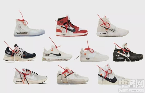 Nike和Offwhite的联名款“The Ten”在今年八月火热推出,一共十双鞋组成的联名系列,包含了众多耐克明星鞋款。设计师Virgil Abloh讲这个系列分为“REVEALING”、“GHOSTING”两个系列。它们一经上市,就受到高度关注,现在的价格已经高达15000元,其中AJ1被称为2017年最昂贵的球鞋。