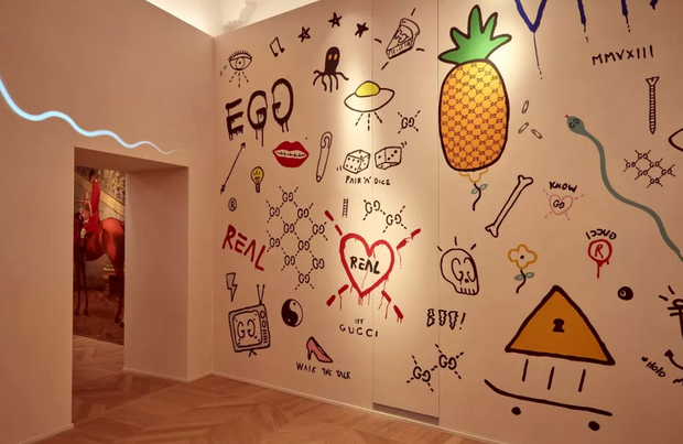 例如Guccification单元中会有“Gucci Ghost”的涂鸦,Gucci去年与西班牙艺术家Coco Capitán联名推出的手稿创作则被印在了Gucci Garden的楼道墙壁上。