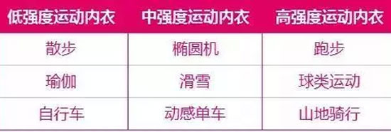 现在很多品牌的运动内衣,在购买的时候就会标明此款运动内衣适合哪一些运动。跑步、骑车、舞蹈……常见的运动都会标明,你可以在此基础上选购你所需要的那一款。
