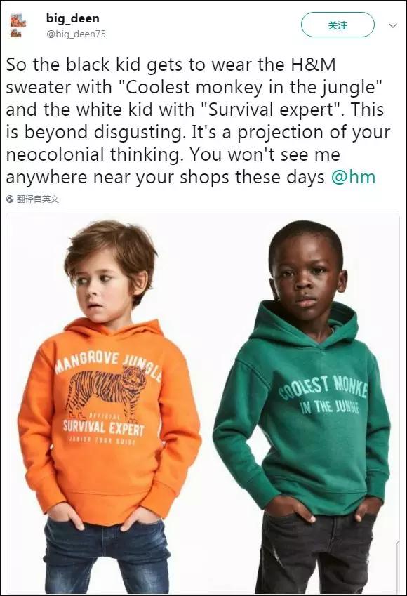 在H&M这张有争议的图片中,一名黑人小男孩身穿绿色套头帽衫,衣服正面赫然印着“丛林中最酷的猴子”几个字。“刺眼”的标语很快被网友发现,随即在社交媒体广泛传播。自上周日开始,大量网友痛批H&M的做法,称其“太不妥”“令人恶心”“没心没肺”,甚至有网友表示要从此抵制H&M。