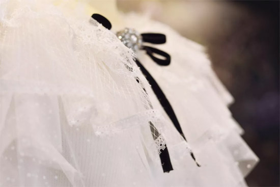 每一处细节的处理都有着丰富的质感,充满生命力,将轻盈质地与精湛的手工艺融合交织。光泽绒感均匀的毛羽呈现出华丽的风格质地,经立体刺绣,细腻而富有层次;领口、胸前与裙摆精致细腻的捏褶,从造型到针线固定,都源自工艺师们灵动的双手。