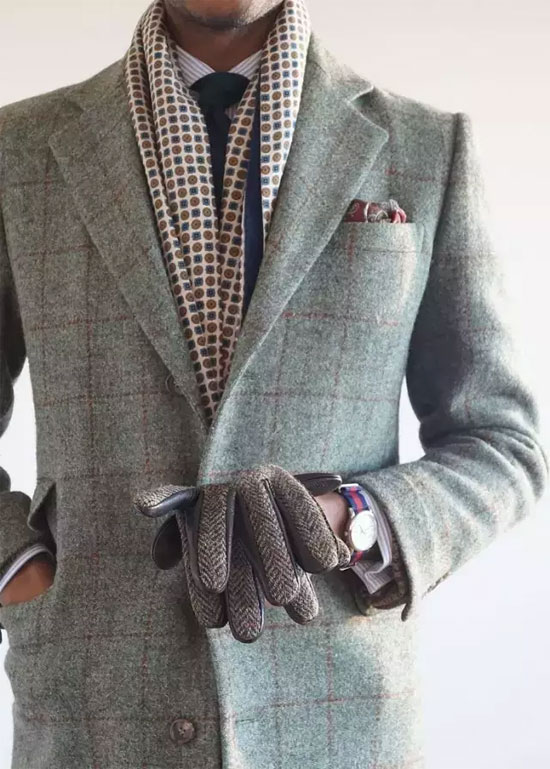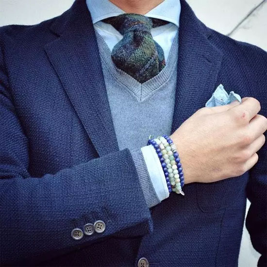由于颜色本身较暗,并不适合用过多的颜色去点缀。格纹或条纹是最明智的。它让你看起来更加精明干练,又充满阳刚!