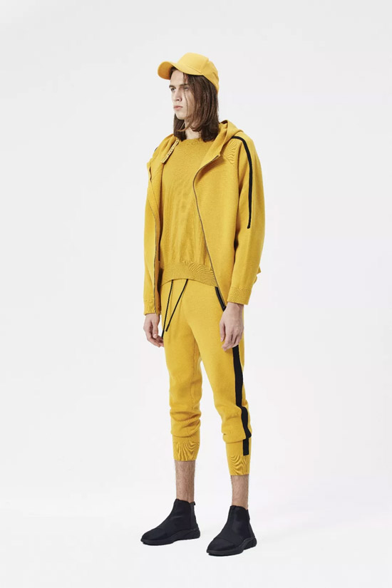 运动风拼接手法从色彩入手,经典黑色和黄色的拼接,搭配用怀旧图像BruceLee作为印花的T恤内搭,将怀旧运动风延续到底,加入的白色色块平衡黄色的高明度跳跃感和黑色的沉闷感,整个设计街头感强烈,同时向BruceLee经典致敬。