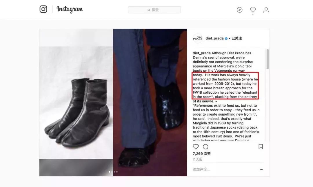 近日,专门揭发时尚圈抄袭事件的Instagram账号@diet_prada发帖指出,Vetements 2018秋冬男装秀上多款鞋涉嫌抄袭比利时知名设计师Martin Margiela 所设计的经典作品Tabi Boots ,该帖子发布后立刻收获7000多次赞以及392条评论,引发双方粉丝在社交媒体上热议。