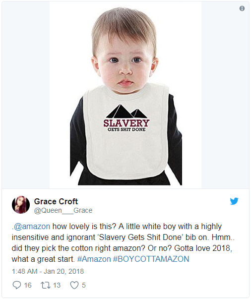 消费者在社交媒体上评论这一事件,推友@Queen___Grace表示:“这有多可爱?一个白人小孩带着带有‘Slavery Gets Shit Done’ 愚昧无知标语的围兜。Emmm……亚马逊批准它们在平台销售了吗?还是没有?”