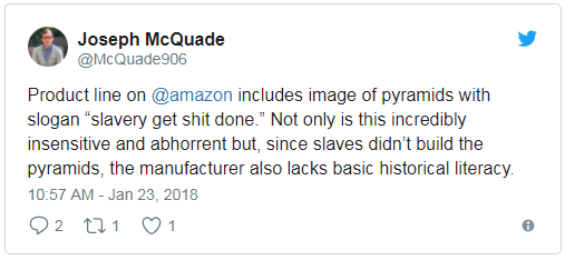 另一位推友@McQuade906表示,带金字塔图案和“Slavery Gets Shit Done”标语,这不仅展示出制造商对奴隶制的麻木,同时也表明它缺少文化知识,因为金字塔的建造者不是奴隶。