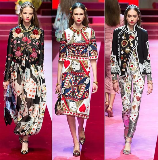 Dolce&Gabbana Showroom里成列的亮片外套上,点缀着扑克刺绣。细小的钉珠覆盖着刺绣使的图案更加立体。金丝线刺绣的蝴蝶结上少许金色亮片,整件衣服更加熠熠生辉。