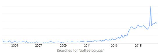 咖啡磨砂膏可以用于去面部和身体角质,这一产品的热销是电商迎合健康潮流的又一例子。以下是咖啡磨砂膏(coffee scrubs)在谷歌上的搜索趋势: