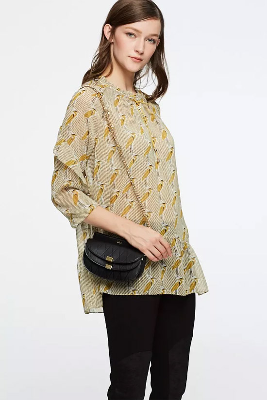 来自奇幻丛林灵感的上衣采用欧洲进口面料、尽显科技的高品位、穿着轻薄舒适,特有的开发设计——鸬鹚印花图案诗意动感;经女性的随心、悠然在隐约性感中诠释;领口与袖子的荷叶边,宽松裁剪与衣下摆的橡筋束口设计凸显立体感---更加的朦胧、展示潮品特有的浪漫、飘逸时尚。