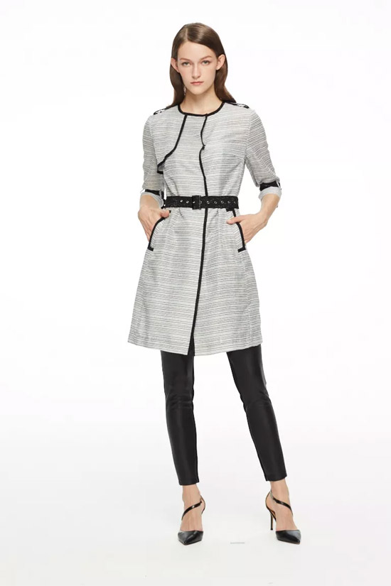 日本进口银葱横条纹面料,手感平顺挺括,连衣裙假两件设计增加视觉层次感,收腰包臀体现女人魅力,外套黑色织带撞色强调视觉感,既可当连衣裙,由可以搭配黑色打底裤,穿法多样。