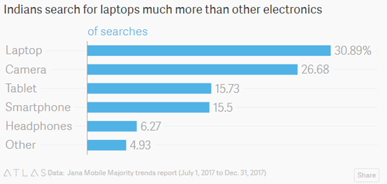 虽然印度是全球第二大智能手机市场,但智能手机在消费电子品类的搜索份额仅为15.5%,比笔记本电脑(30.89%)、相机(26.68%)和平板电脑(15.73%)的搜索份额还低。