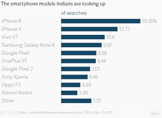 以下是印度市场中,智能手机型号的搜索份额数据:
